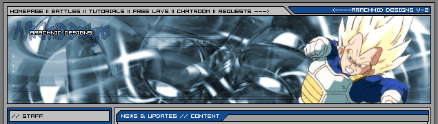 :: Update: Well as you Guys must see we have a new Layout here on Arachnid Designs. i think it fits the site Pretty Well. Im gonna be hard at work changing all the pages to this Lay as soon as i map it. Which will be soon. All Managers and Asst must Have 310 x 50 Aviaters For this lay and we are gonna start haveing DAILY updates on this site!