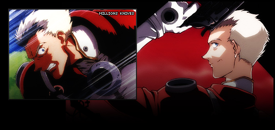 the sun shone down through the cloudless blue sky of gunsmoke, knives had found himself traveling the planet for the first time in many years, prepairing for his attacks on human civilization, and his brother, vash the stampede. he was in lewiston town, which was a medium sized human town located in the dankin region of gunsmoke, it was packed full of children, all happy and careless, knives could never understand this, his childhood had been so painful. Knives walked down a dark alleyway between two mud brick buildings kicking up a small cloud of dust as he came to a wooden door.