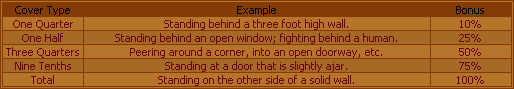 Cover is one of the best defensive advantages that a player has, allowing a character to duck behind a wall or around a counter to effectively gain a tactical edge in combat. The mechanics are pretty simple, when a character takes cover they will be given an attempt to make a defensive save attempt (by rolling over a set number on a d100). The percentage chance that your character will negate damage is based on the amount of cover they have taken. Below you will find a table which details each type of cover and lists their save percentages.