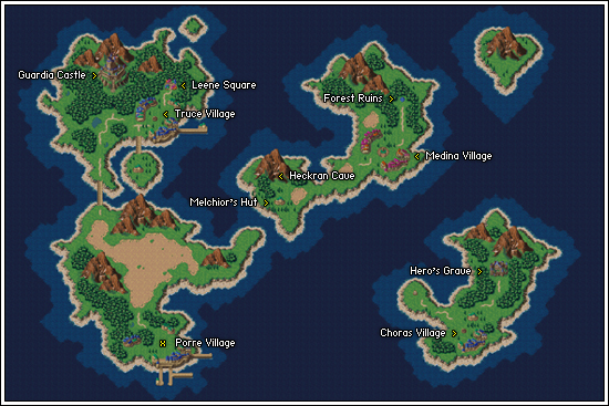 The seat of power for the Kingdom of Guardia, Guardia Castle is a grand structure built on top of a large natural plateau. The castle itself is home to Queen Marle who is a direct decendant of Queen Leene for which Leene Square was named. The castle is surrounded by Guardia Forest which is populated with several different wild beasts which can make travel between the castle and Truce village dangerous. |