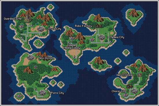 Once as small town tucked away in the far southeast Choras like the other cities in this time has grown into a domed metropolis and continues to expand. Along with the growth in the city Choras has also founded a small mining dome nearby which supplies the factory which was built just to the north of the city to build machines and robots to better improve the world of the future, which avoided the ruin that was Lavos. |